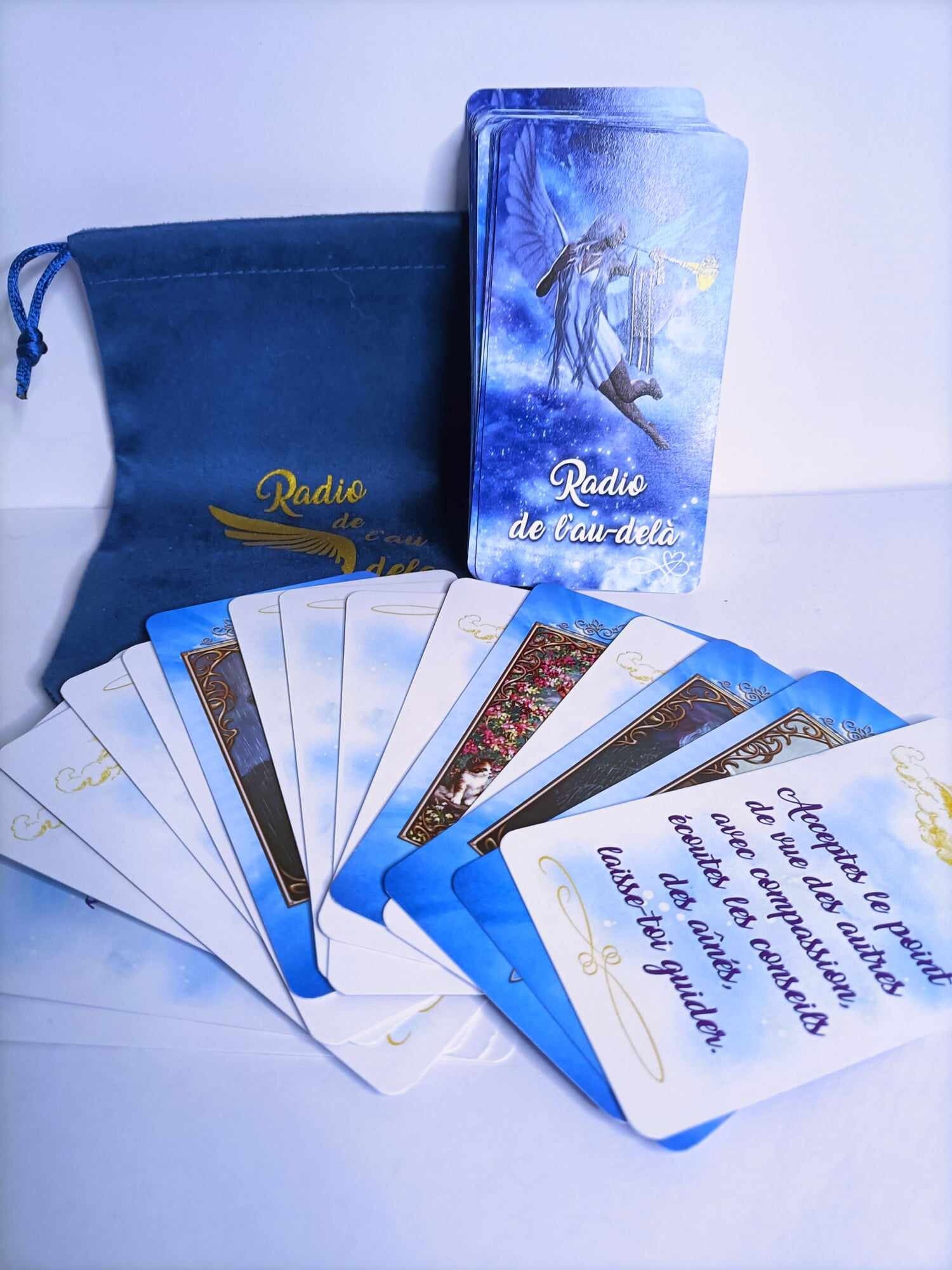 une notice d'exemple de tirage ainsi que sa pochette de rangement en suédine bleu personalisé au nom de votre jeu de divination.