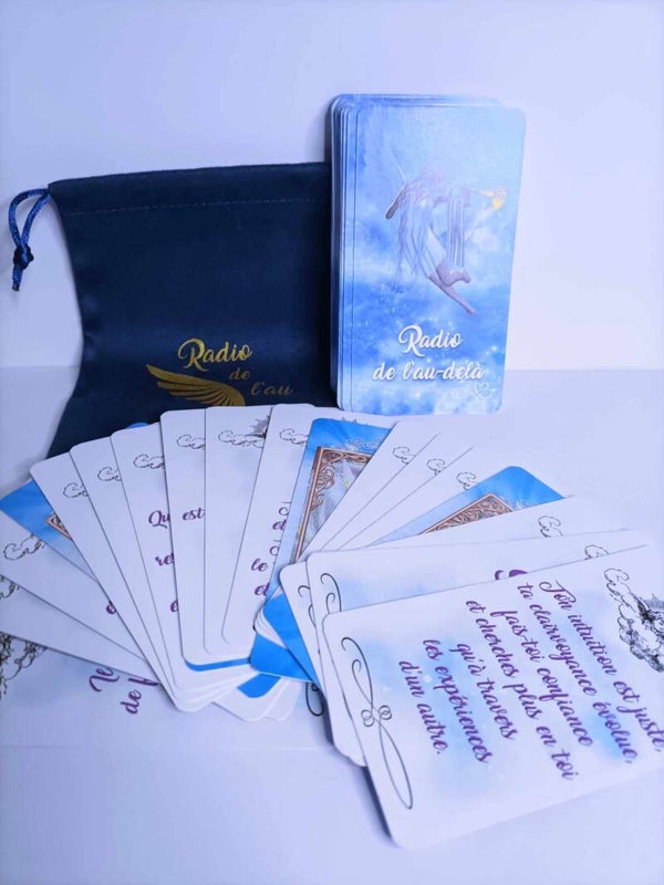 une notice d'exemple de tirage ainsi que sa pochette de rangement en suédine bleu personalisé au nom de votre jeu de divination.