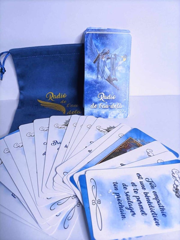 une notice d'exemple de tirage ainsi que sa pochette de rangement en suédine bleu personalisé au nom de votre jeu de divination.