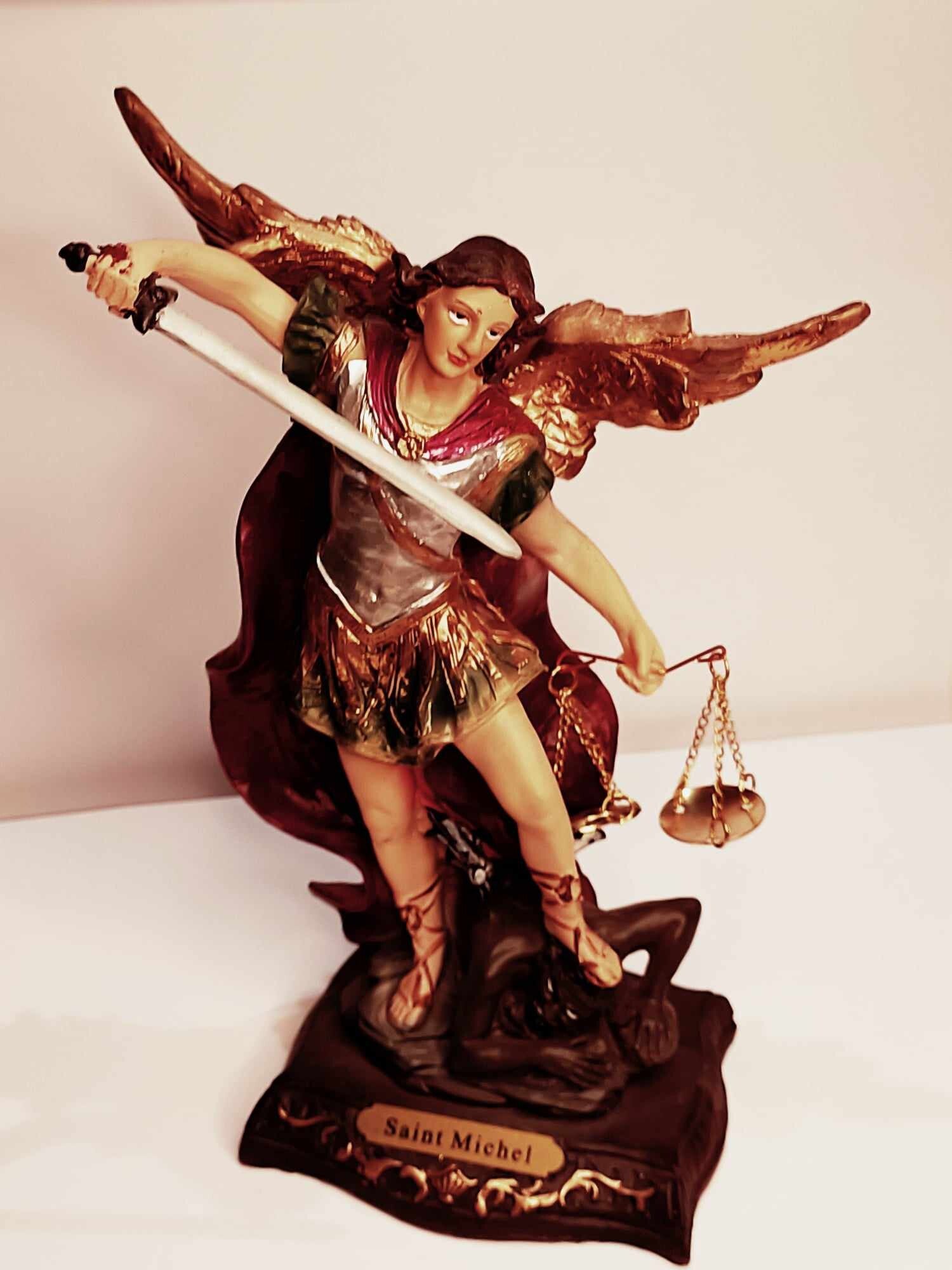 Statue résine peinte à la main de St Michel avec balance de la justice hauteur 20 cm
