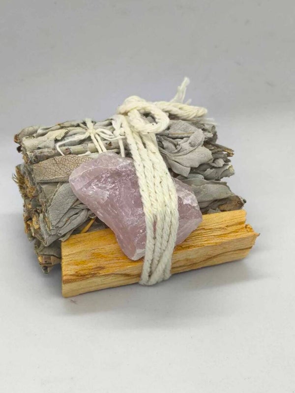 Découvrez le trio protection et purification : sauge blanche, palo santo et Quartz rose. Ce kit complet est idéal pour purifier et proteger vos espaces et faire entrée l'amour, la tendresse, les amitiés, la douceur grâce au quartz rose. Parfait pour les amateurs de lithothérapie ou comme cadeau pour s’initier aux rituels de protection et purification.