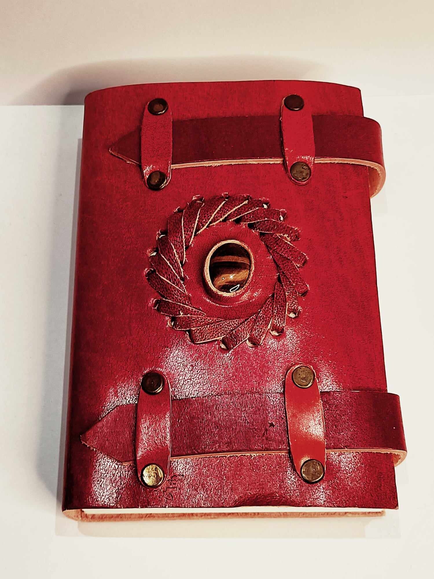Carnet, Grimoire en cuir, feuille vegetale et œil de tigre.