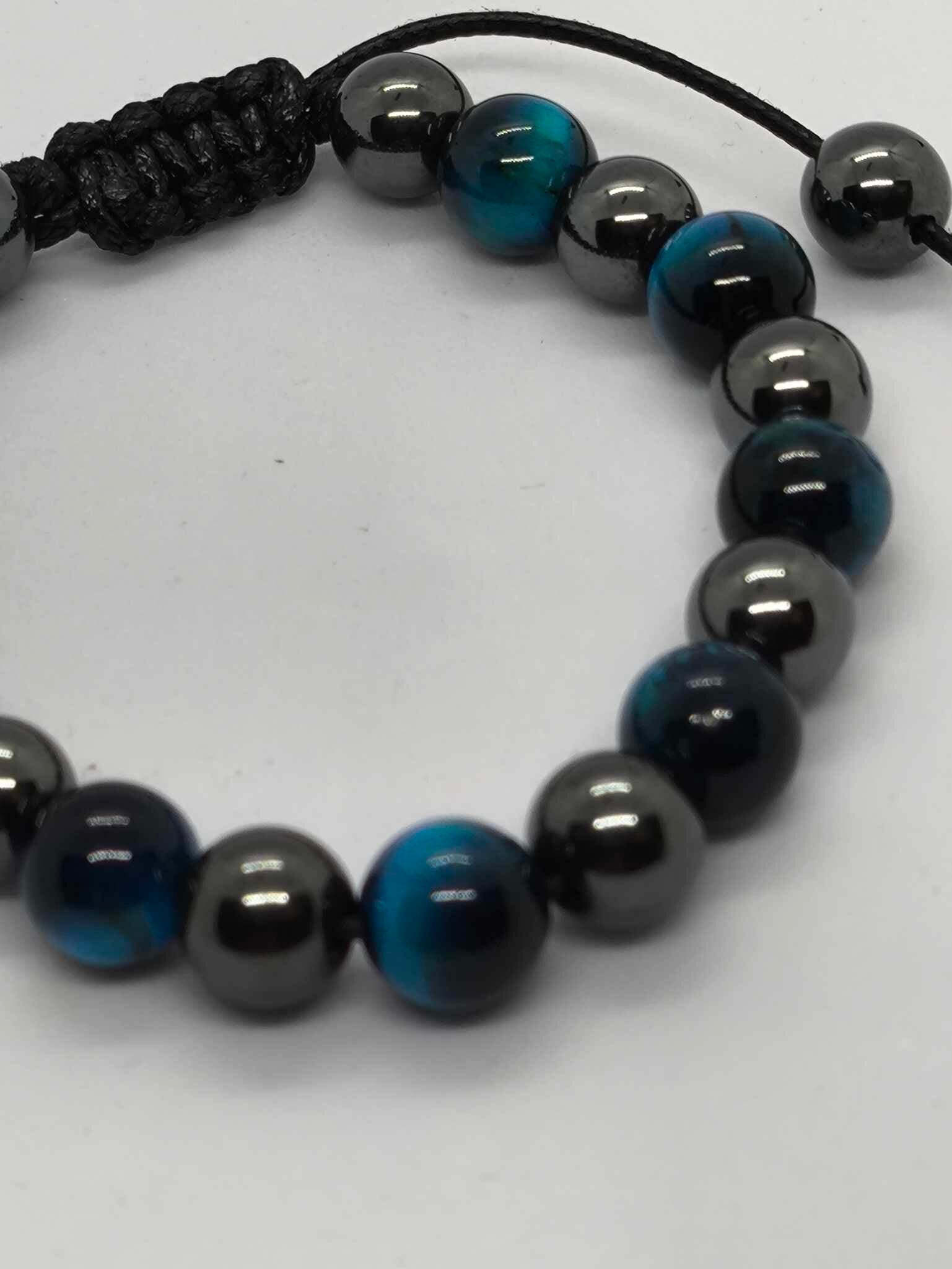 Bracelet Oeil de Tigre bleu & hématite perle de dimètre 8. Bracelet règlable.
