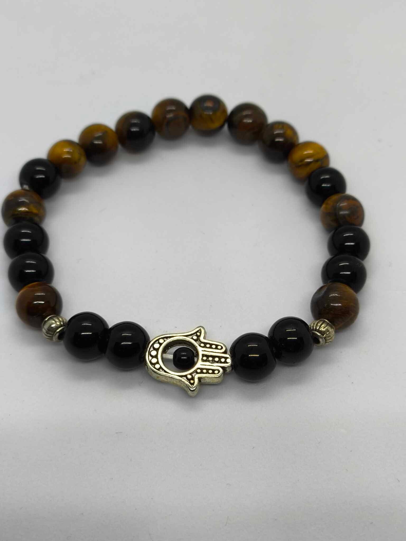 Un bracelet combinant œil de tigre et obsidienne, avec un motif de protection main de Fatma (ou Hamsa), est un puissant symbole de protection et de force. Voici les propriétés de ces pierres et du symbole :