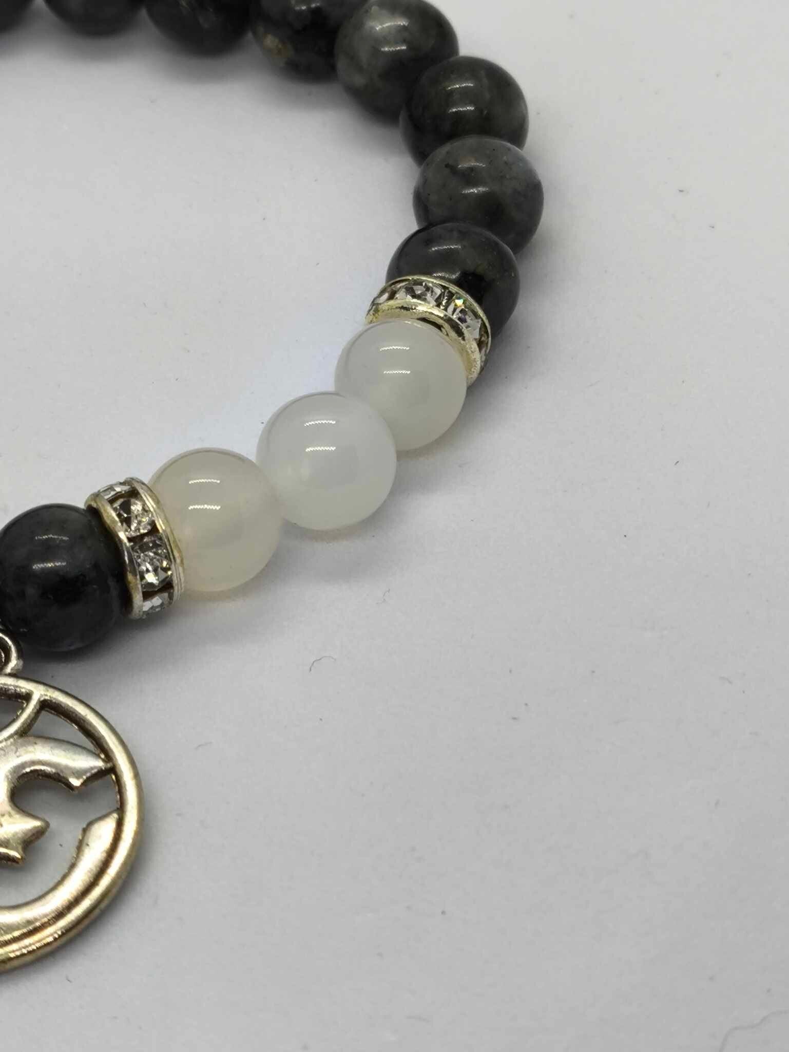 Bracelet Labradorite & Agate Blanche. Symbôle OM Perle de diamètre 8.