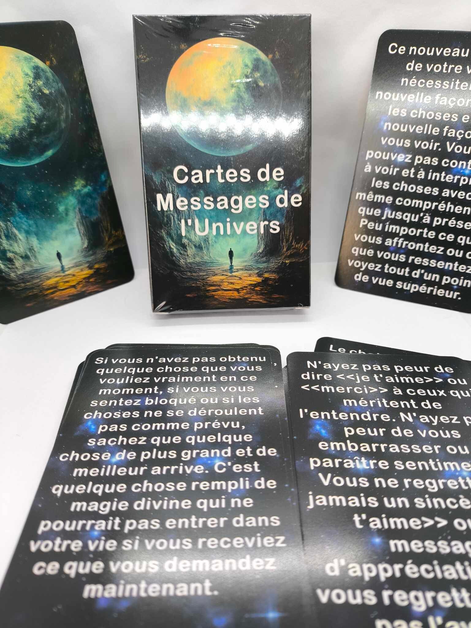 Les cartes Messages de l'univers est composé de 54 cartes comprenant des messages inspirants de vos guides pour vous aider à trouver de la force lorsque vous êtes abattu, de la synchronicité et du soutien lorsque vous êtes perdu, de la sécurité face à l'incertitude, et de la joie en toutes circonstances.